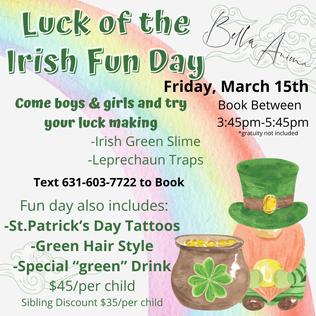 Join Bella Anima Parties at the Shoppes at East Wind in Wading River for Luck of the Irish Fun Day where kids will make Irish green slime and Leprechaun traps. Fun Day will also include St. Patrick’s Day tattoos, a green hairstyle, and a special green drink. $45/child (sibling discount $35/child) not including gratuity. Text to book your time slot between 3:45 and 5:45 p.m. at 631-603-7722 and visit Bella Anima for info on public and private parties and events. Mention Petite North Fork when booking for something extra special.