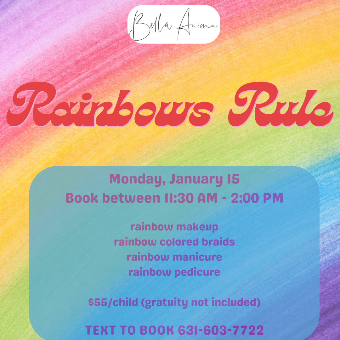 Join Bella Anima Parties in Wading River for a day of rainbow everything including rainbow makeup, rainbow colored braids, rainbow pedicures, and rainbow manicures. $55/child (not including gratuity). Text to book at 631-603-7722 and visit Bella Anima for info on public and private parties and events. Mention Petite North Fork when booking.