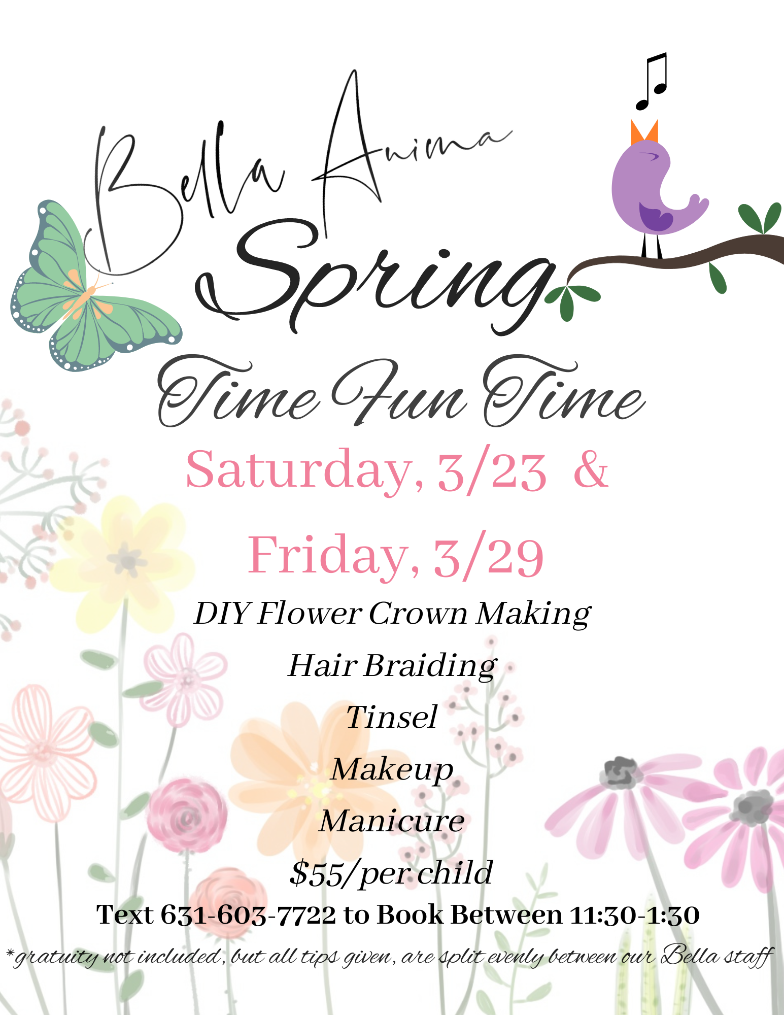 Join Bella Anima Parties at the Shoppes at East Wind in Wading River for Springtime Fun Time including hair braiding, hair tinsel, makeup, a manicure, and DIY flower crown making. $55/child not including gratuity. Text to book your time slot between 11:30 a.m. and 1:30 p.m. at 631-603-7722 and visit Bella Anima for info on public and private parties and events. Mention Petite North Fork when booking for a free additional hair tinsel.
