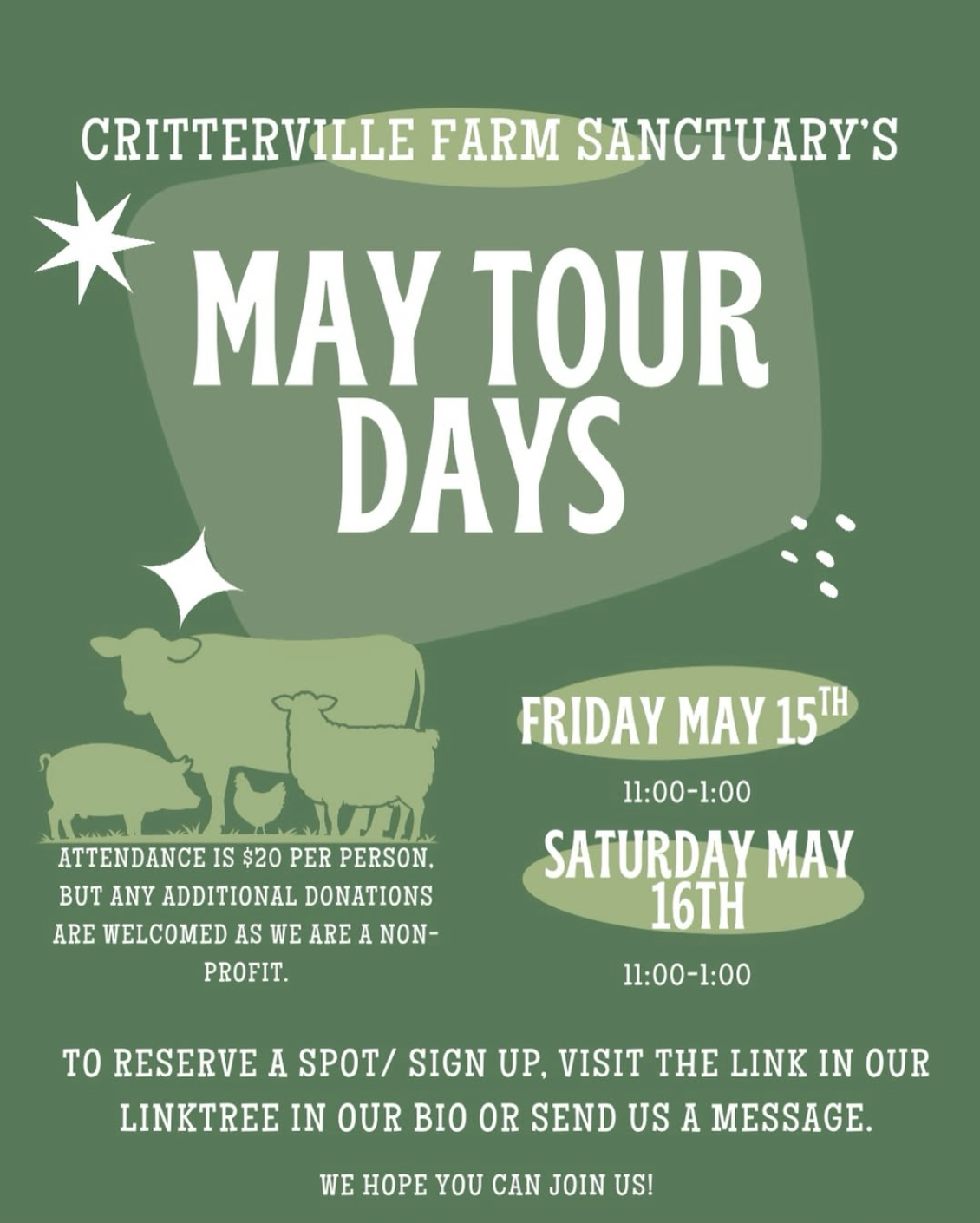 Back to All Events Critterville Farm Sanctuary's May Tour Days Friday, May 15, 2026 11:00 AM 1:00 PM Critterville Farm Sanctuary Exact address upon RSVP Riverhead, NY United States (map) Google Calendar ICS