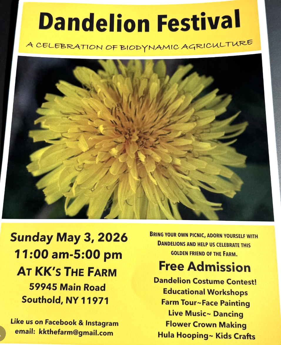 Dandelion Festival Sunday, May 3, 2026 11:00 AM 5:00 PM KK's The Farm 59945 Main Road Southold, NY, 11971 United States (map) Google Calendar ICS