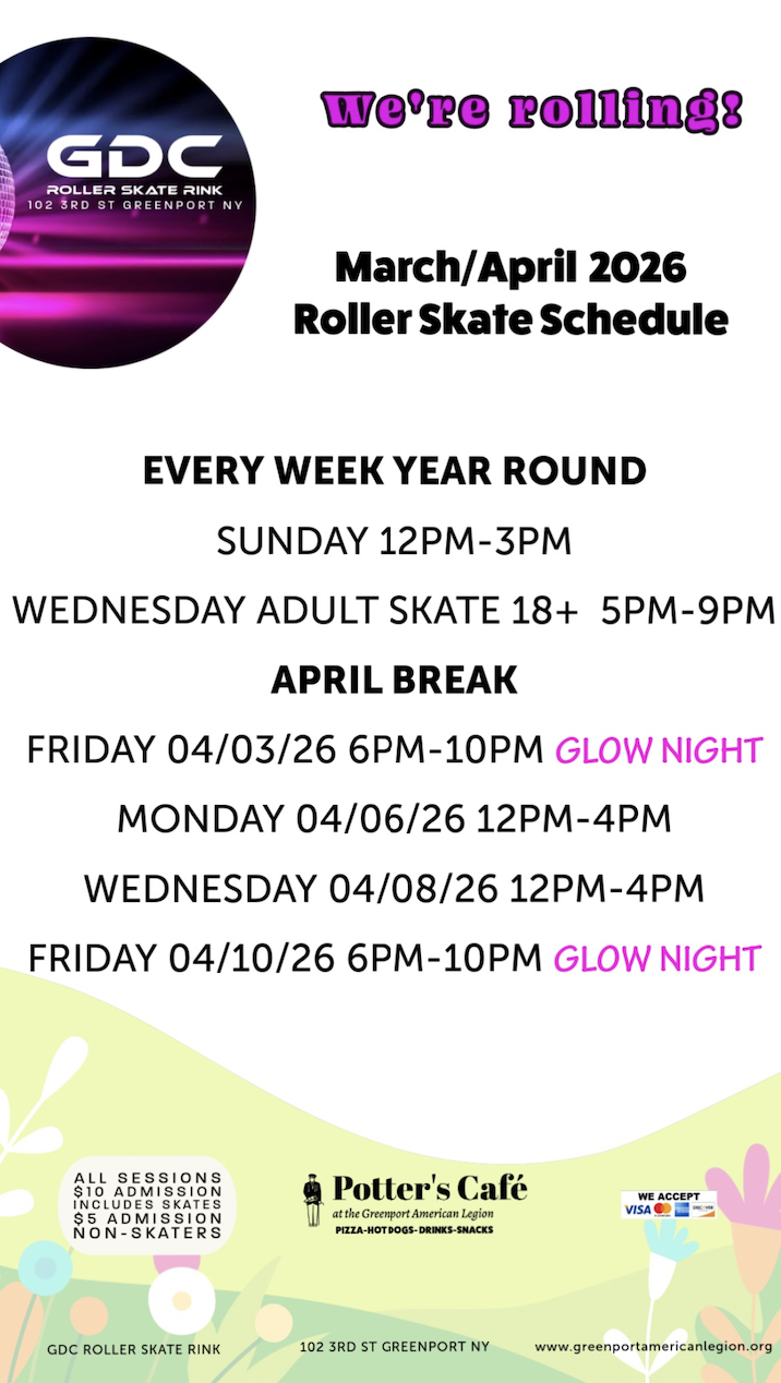 Back to All Events GDC Roller Rink April Break Skate Friday, April 10, 2026 6:00 PM 10:00 PM GDC Roller Skate Rink 102 3rd Street Greenport, NY, 11944 United States (map) Google Calendar ICS