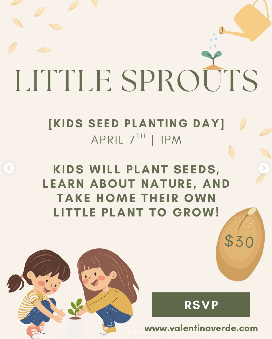 Back to All Events Little Sprouts Seed Planting Day for Kids Tuesday, April 7, 2026 1:00 PM 2:00 PM Valentina Verde Botanica at The Shoppes at East Wind 5768 New York 25A Wading River, NY, 11792 United States (map) Google Calendar ICS REGISTER HERE
