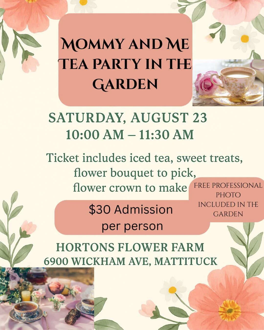 Head to Horton's Flower Farm on Saturday, 8/23 at 10 a.m., in Mattituck for a morning of flower picking, tea and treats, crafts, and more. Tickets cost $30/person. Use code tea3 at checkout for a discount for Petite North Fork readers. Purchase your tickets here.