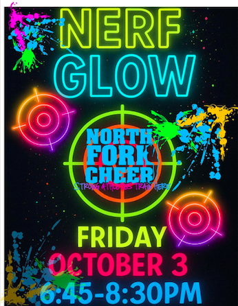 Don’t miss the ultimate glow-in-the-dark Nerf battle at North Fork Cheer! Grab your spot NOW—registration is open, but spots are limited.