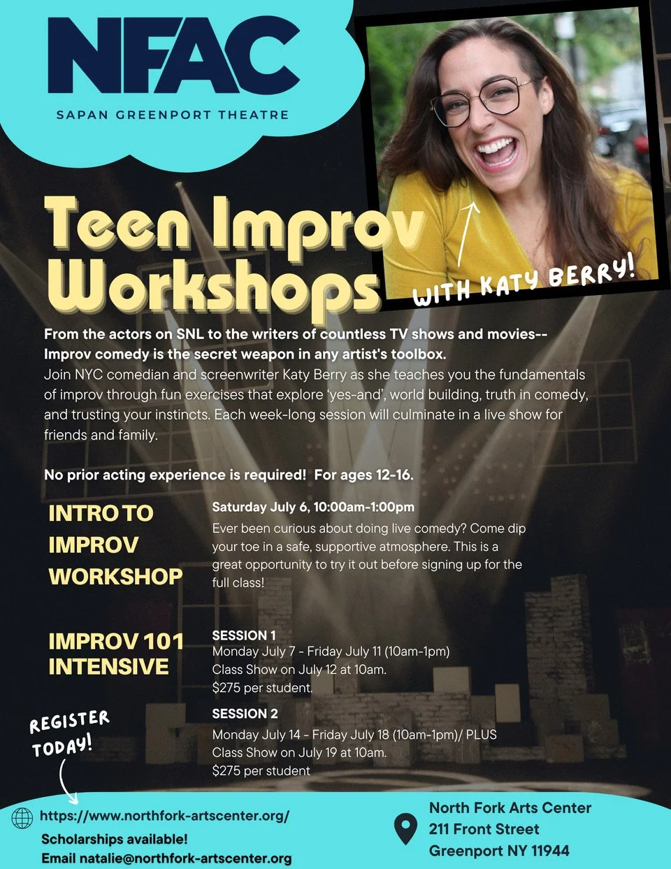 Back to All Events NFAC Teen Improv Workshop Sunday, July 6, 2025 10:00 AM 1:00 PM North Fork Arts Center 211 Front Street Greenport, NY, 11944 United States (map) Google Calendar ICS