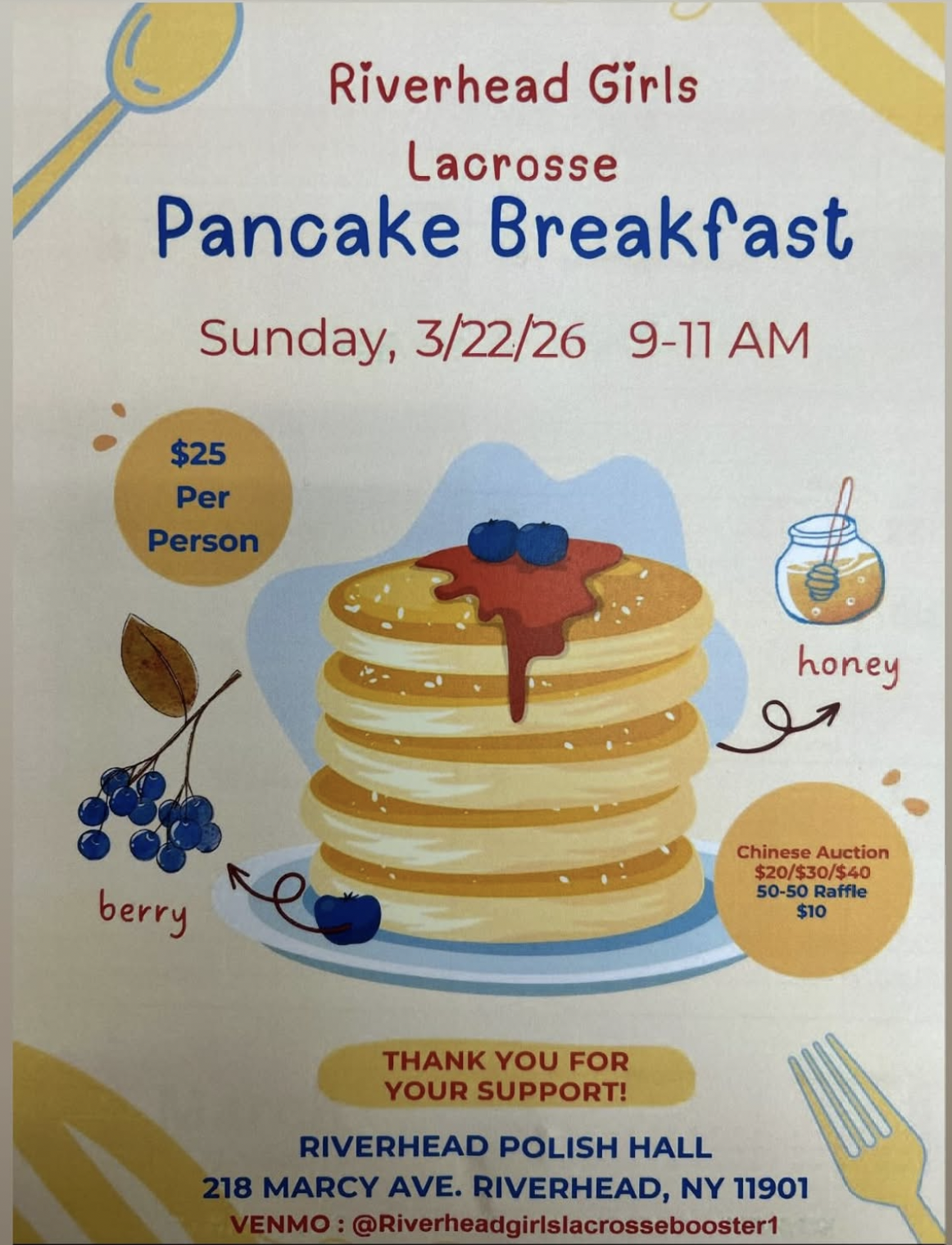 Back to All Events Pancake Breakfast Fundraiser for Riverhead Girls Lacrosse Sunday, March 22, 2026 9:00 AM 11:00 AM Riverhead Polish Hall 214 Marcy Avenue Riverhead, NY, 11901 United States (map) Google Calendar ICS