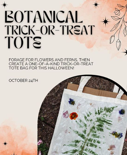 Join Stephanie of Its a Vibe for a Flower Pressed Pumpkin workshop on Thursday, Oct., 24 from 5:30 to 7 p.m. Forage through the beautiful gardens for flowers and ferns, then create a one-of-a-kind trick-or-treat tote bag for this halloween!