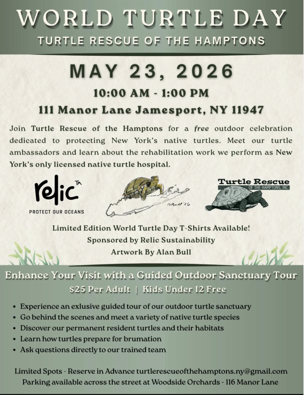 World Turtle Day Celebration Saturday, May 23, 2026 10:00 AM 1:00 PM Turtle Rescue of the Hamptons 111 Manor Lane Jamesport, NY, 11947 United States (map) Google Calendar ICS
